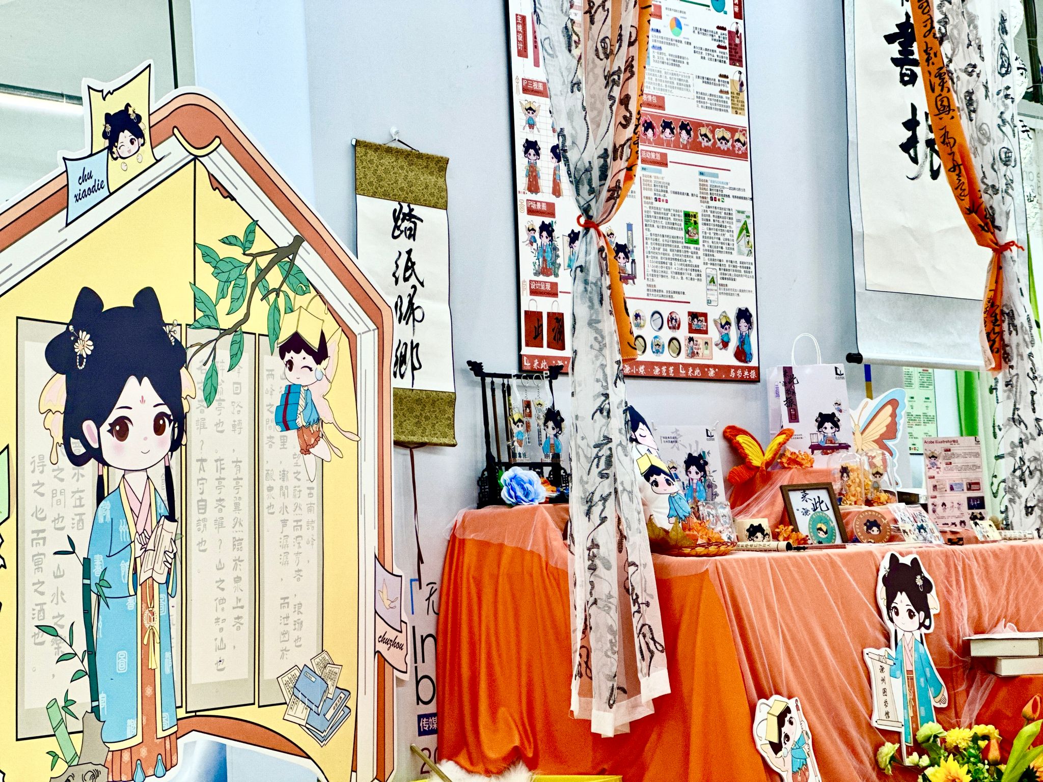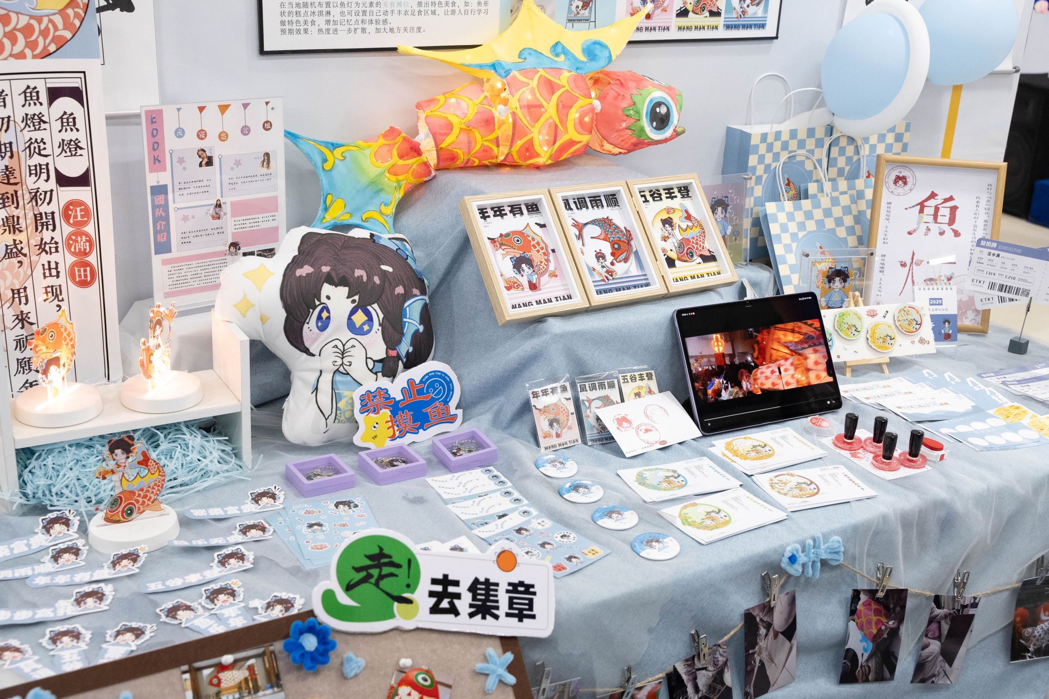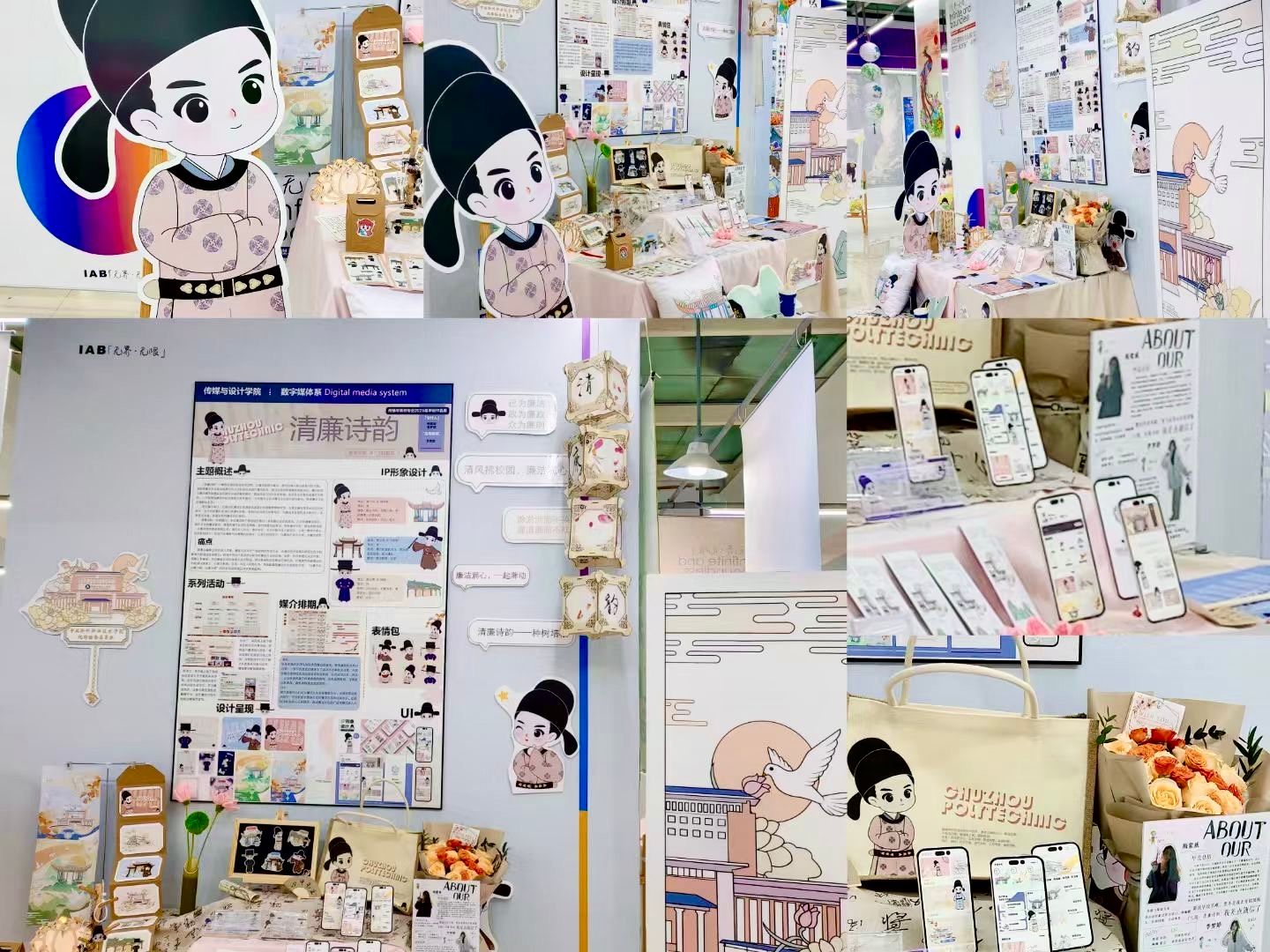 在展览现场,“南谯文旅&滁职”联合展位前,同学们将滁菊品牌形象与推广策略进行了全面的升级提档,无“菊”无束、“菊”世无双、别“菊”一格等系列化IP设计与推广策略,生动有趣且充满活力,吸引了众多观展师生;在“来滁与书共振”展位,同学们将滁州图书馆的建筑元素与地方文化结合,创新出“滁小蝶”“滁茧茧”等形象,并策划了全年11个可执行、能落地的推广活动方案;井楠茗宿作为南谯区人气景点,同学们通过扎根当地,对其文化因子进行提取和梳理,罗列出了详细的创意方案,一件件充满诗意的文创产品,十分精美;华体体育在线登录廉洁文化品牌也设立了主题展位,以欧阳修、王阳明等具有地方代表性人物为原型,通过UI界面、策略推广等年轻化的视觉传达完整呈现,广受好评。还有一些观展师在“一叶落此峰”施集毛峰展位前驻足良久,仔细了解其背后的地方茶文化相关内涵。在影像单元,《父辈的梦想》、《龟兹》和《太空行》等作品,将科技梦想、非遗传承通过数字技术进行了数字化呈现。值得一提的是,每个展位都设置了有趣的互动环节。