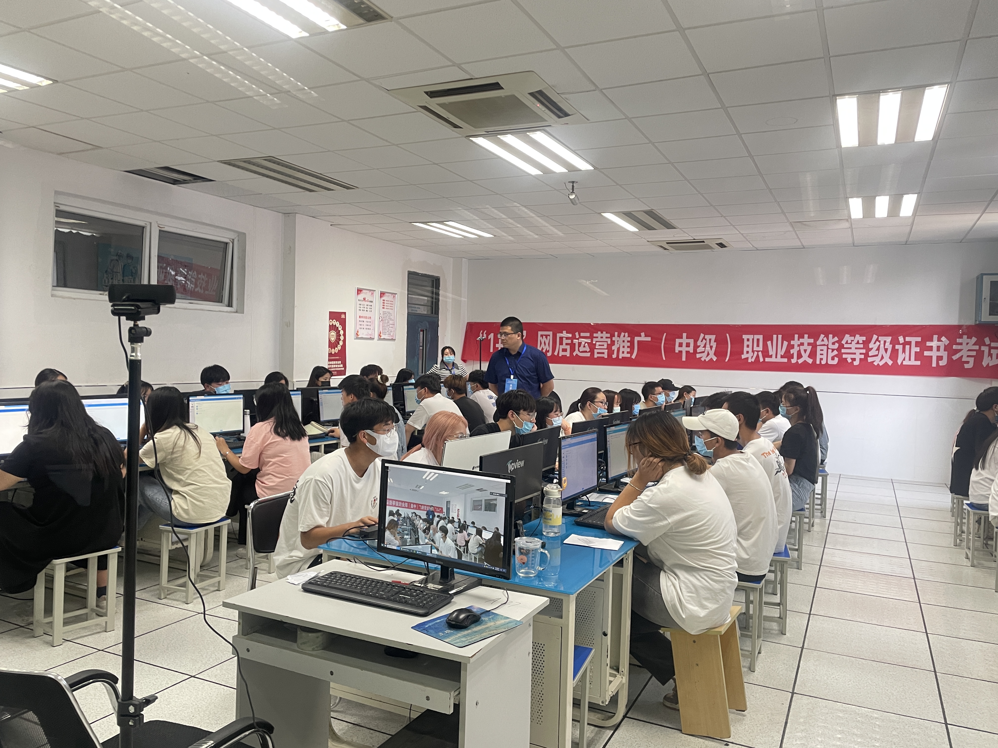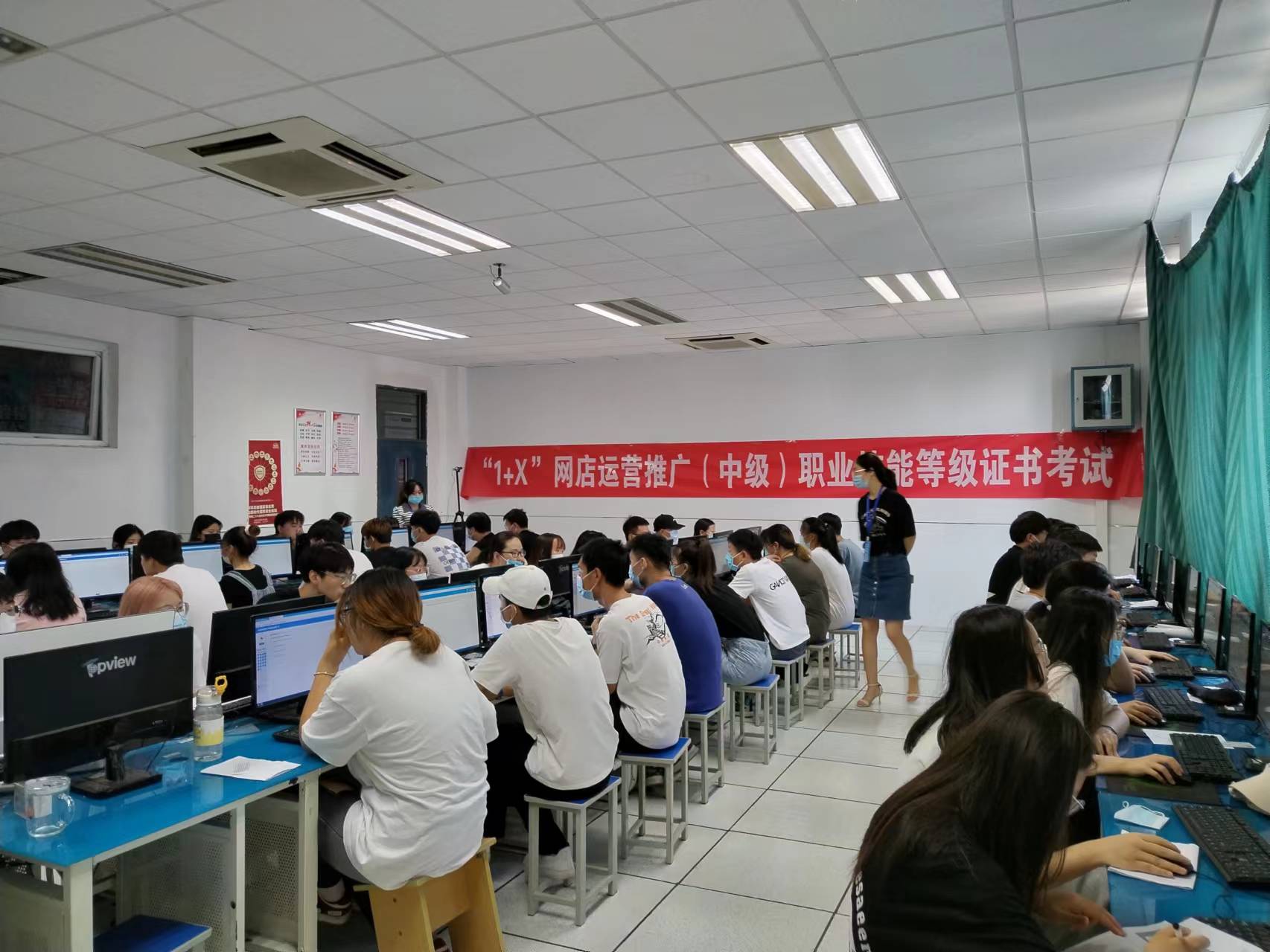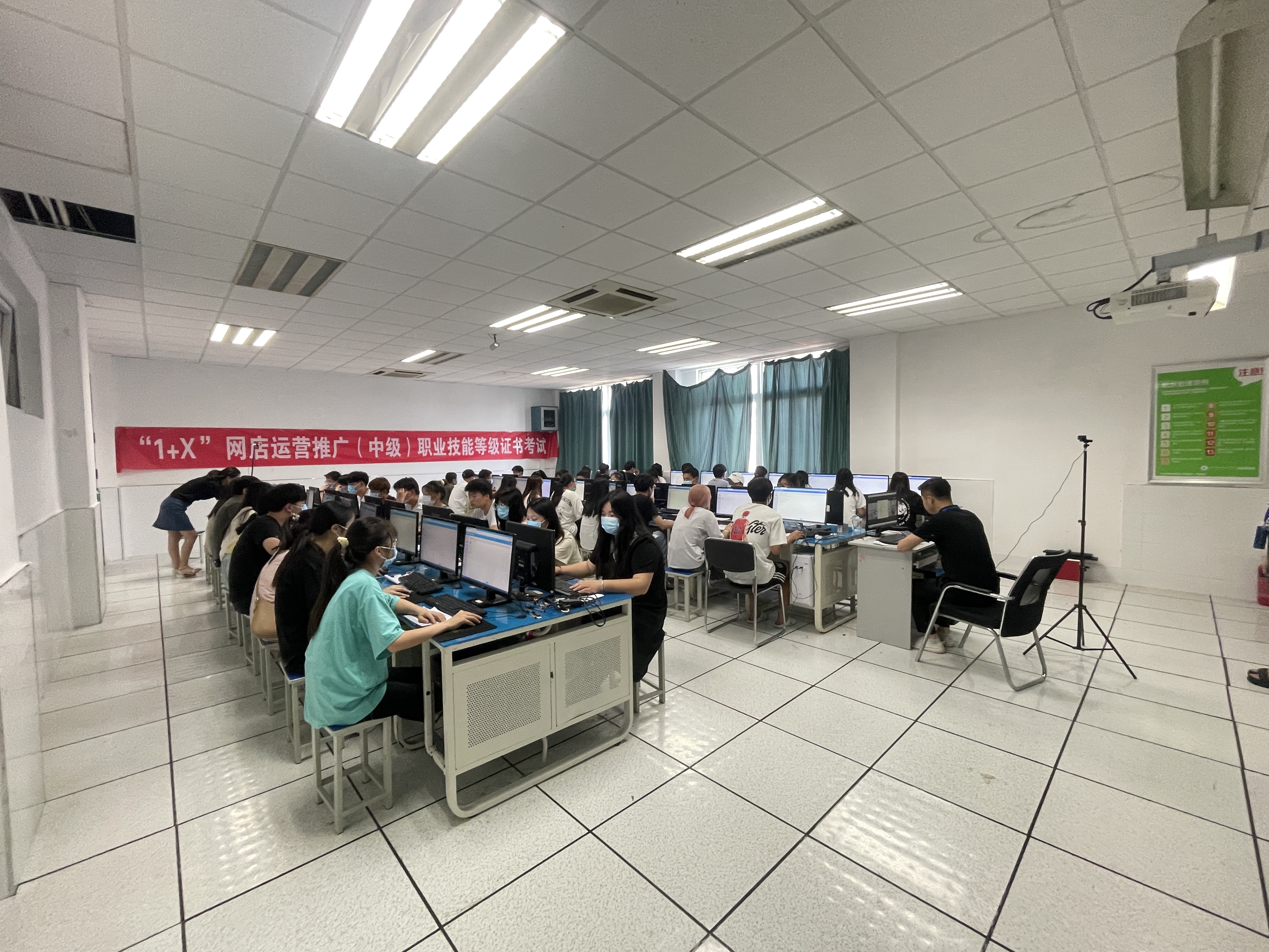 互联网学院为了更好的贯彻落实《国家职业教育改革实施方案》中“1+X”证书制度试点工作的要求,加快推进华体体育在线登录课证融通教学改革实践。一直积极开展“1+X”证书相关的学生培训及考试组织工作,并于2022年6月18日,成功组织2020级电子商务专业学生,共计50名学生参与了《“1+X”网店运营推广(中级)》的考试。副校长苏有良、互联网学院院长姚小园、校实训中心副主任刘杰、商学院电子商务系主任杨剑到现场指导工作。