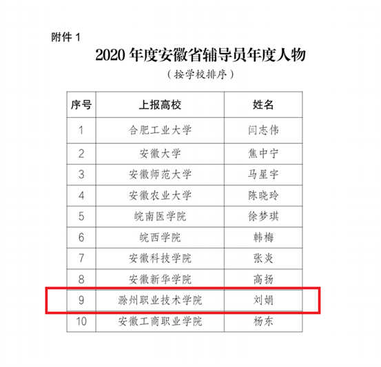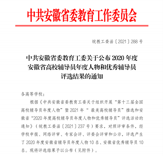 近日,中共安徽省委教育工委下发了《关于公布2020年度安徽省高校辅导员年度人物和优秀辅导员评选结果的通知》(皖教工委函〔2021〕288号)文件,华体体育在线登录传媒与设计学院辅导员刘娟获2020年度安徽省辅导员年度人物。全省共有10名辅导员获此殊荣,有8所本科院校,2所高职院校。同时,刘娟被推荐参加教育部“第十三届全国高校辅导员年度人物”暨2021年“最美高校辅导员”评选。